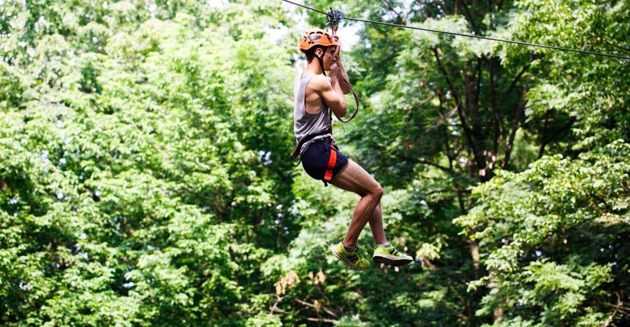 Position assise, câbles de longueur variable, vitesse modérée. C'est le format de base, accessible dès 30 kg, sans condition physique particulière. Notre recommandation pour les familles avec enfants ou ceux qui découvrent la tyrolienne : c'est suffisant pour prendre de la hauteur et observer la canopée sans stress.