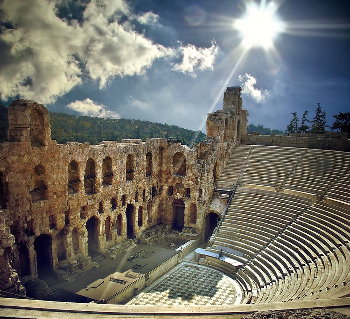 Adossé au versant sud de l’Acropole, l’Odéon d’Hérode Atticus fut construit en 161 apr. J.-C. par le riche mécène Hérode Atticus en mémoire de son épouse. Ce théâtre couvert à l’origine, entièrement bâti en pierre, accueillait concerts et représentations de prestige. Restauré au XXe siècle, il a retrouvé sa vocation artistique et sert aujourd’hui de cadre aux grandes soirées du Festival d’Athènes, dans une acoustique remarquable.