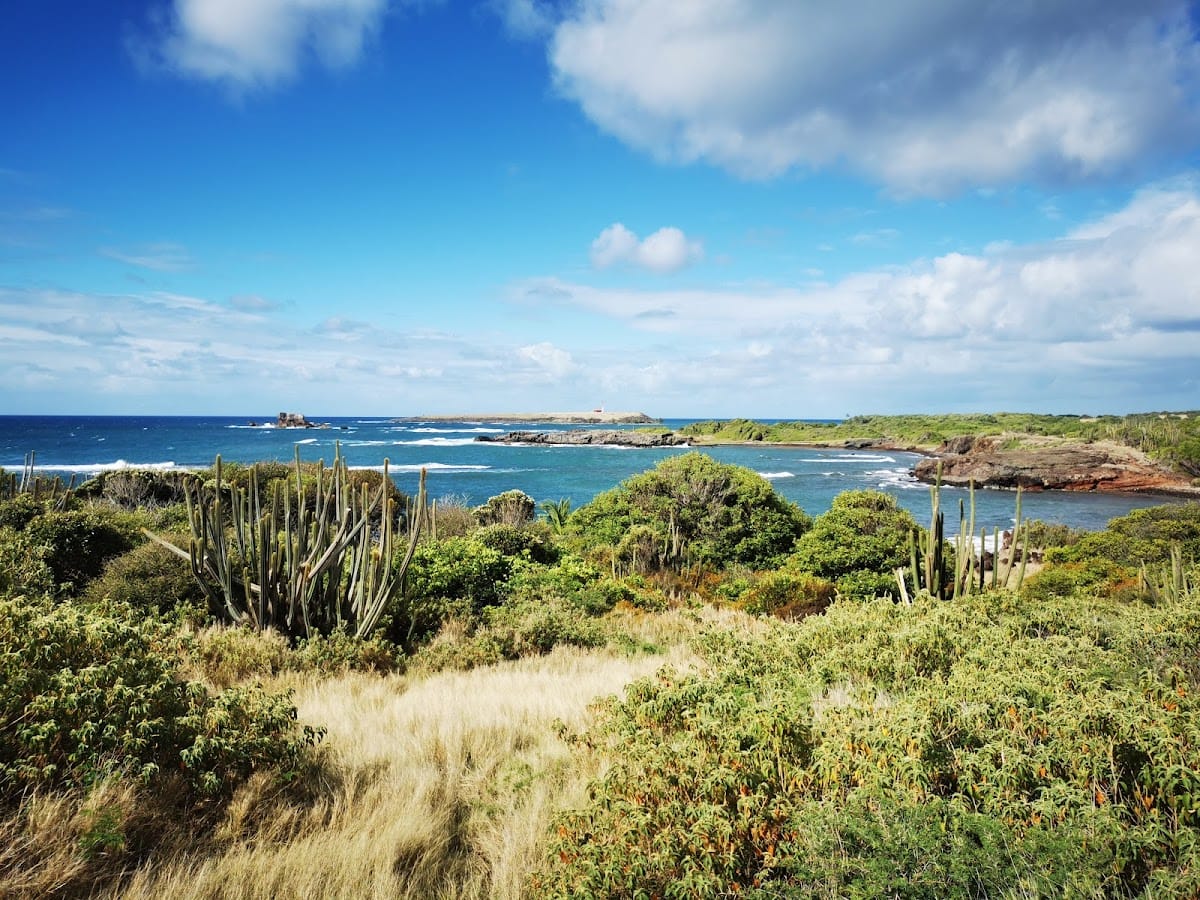 La Savane des Pétrifications abrite l’un des rares écosystèmes arides de Martinique, résultat d’un microclimat particulièrement sec sur la presqu’île de Sainte-Anne. La végétation rase s’accroche à un sol rocailleux fissuré, témoignant d’un ancien volcanisme et d’une adaptation remarquable à la sécheresse. Cactus candélabres, poiriers pays et raisinier bord de mer composent ce paysage minéral qui contraste fortement avec la luxuriance tropicale habituelle de l’île.