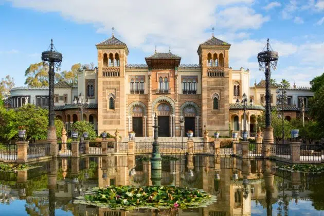 La façade néo-mudéjare, conçue pour l’Exposition ibéro-américaine de 1929, illustre parfaitement la fusion artistique entre l’art islamique et les influences espagnoles. Ses arcs en fer à cheval, ses briques exposées et ses carreaux colorés symbolisent l’âme andalouse. Construit dans le parc María Luisa, ce pavillon qui abrite le musée se démarque par ses lignes élégantes et ses motifs ornementaux uniques.